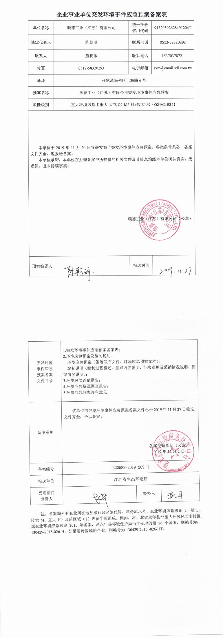 【提要形貌】ag真人官方网工业(江苏)有限公司突发情形事务应急预案备案表